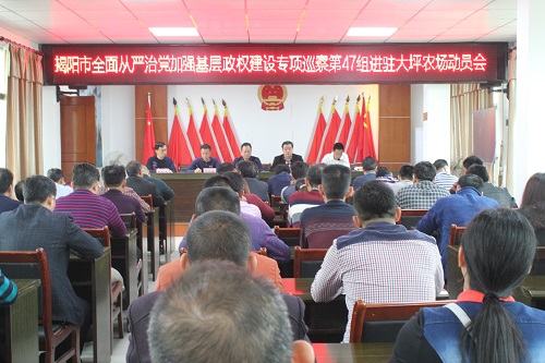 為深入貫徹落實(shí)揭陽市委六屆六次全會精神,揭陽市全面從嚴(yán)治黨加強(qiáng)基層政權(quán)建設(shè)專項巡察組將進(jìn)駐普寧各鄉(xiāng)鎮(zhèn)場街道,對普寧市28個鄉(xiāng)鎮(zhèn)場街道568個村(社區(qū))黨組織(延伸到村民小組)開展為期三個月的全面從嚴(yán)治黨加強(qiáng)基層政權(quán)建設(shè)專項巡察。2019年3月19日,揭陽市全面從嚴(yán)治黨加強(qiáng)基層政權(quán)建設(shè)專項巡察第47組組長吳振旭帶領(lǐng)其他成員共3人進(jìn)駐大坪農(nóng)場。3月20日上午,大坪農(nóng)場召開市全面從嚴(yán)治黨加強(qiáng)基層政權(quán)建設(shè)專項巡察工作動員會議,會議由場黨委書記官錦周同志主持,參加會議的人員有揭陽市委專項巡察組全體同志,普寧市掛鉤大坪農(nóng)場領(lǐng)導(dǎo),場機(jī)關(guān)全體干部職工、村(社區(qū))“兩委”成員、鄉(xiāng)賢咨詢委員會代表及村民代表等40多人。